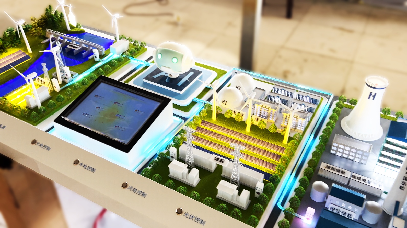 智能可控沙盤模型的設(shè)計,不同于其他項目的設(shè)計,它不是創(chuàng)意的集中展示,而是真實系統(tǒng)的寫實還原。本項目設(shè)計工作在正式開展前,多次與客戶溝通真實場景圖紙及模型所需呈現(xiàn)的要素,對整體的架構(gòu)及排布有了初步了解?;趯δP涂蚣芙Y(jié)構(gòu)及場景概念的了解,設(shè)計工作順利開展,通過現(xiàn)代化的設(shè)計手段,并綜合3D打印技術(shù)、LED流動光源、AI機器人、霧化流動等技術(shù)效果,精細(xì)設(shè)計模型中的一角一線、一點一面,材質(zhì)和線、角、面等外立面結(jié)構(gòu),加以寫實、高純度、層次分明的色彩,將真實系統(tǒng)按照一定比例縮放,從而呈現(xiàn)更加智能、流暢、可控的模型組合。