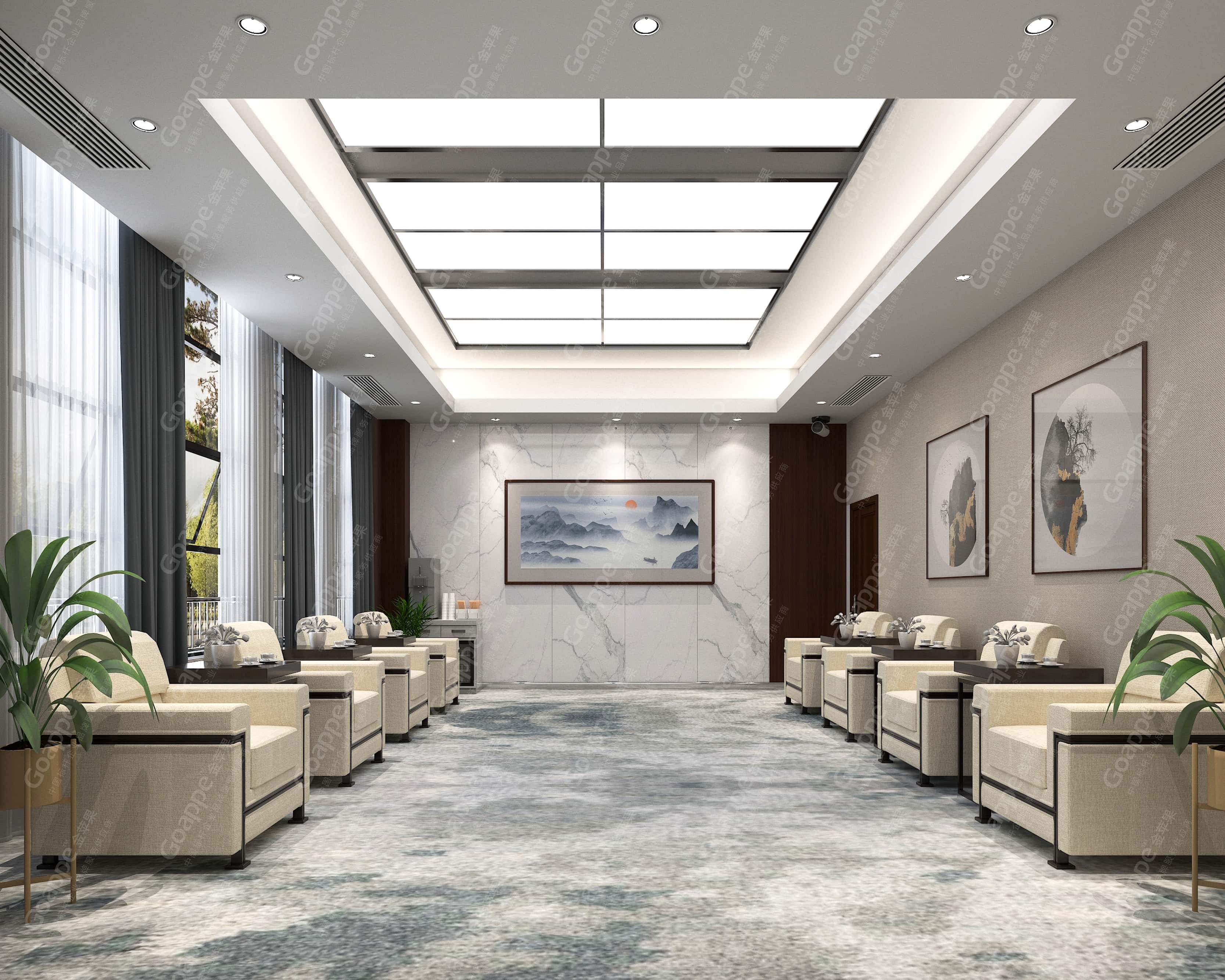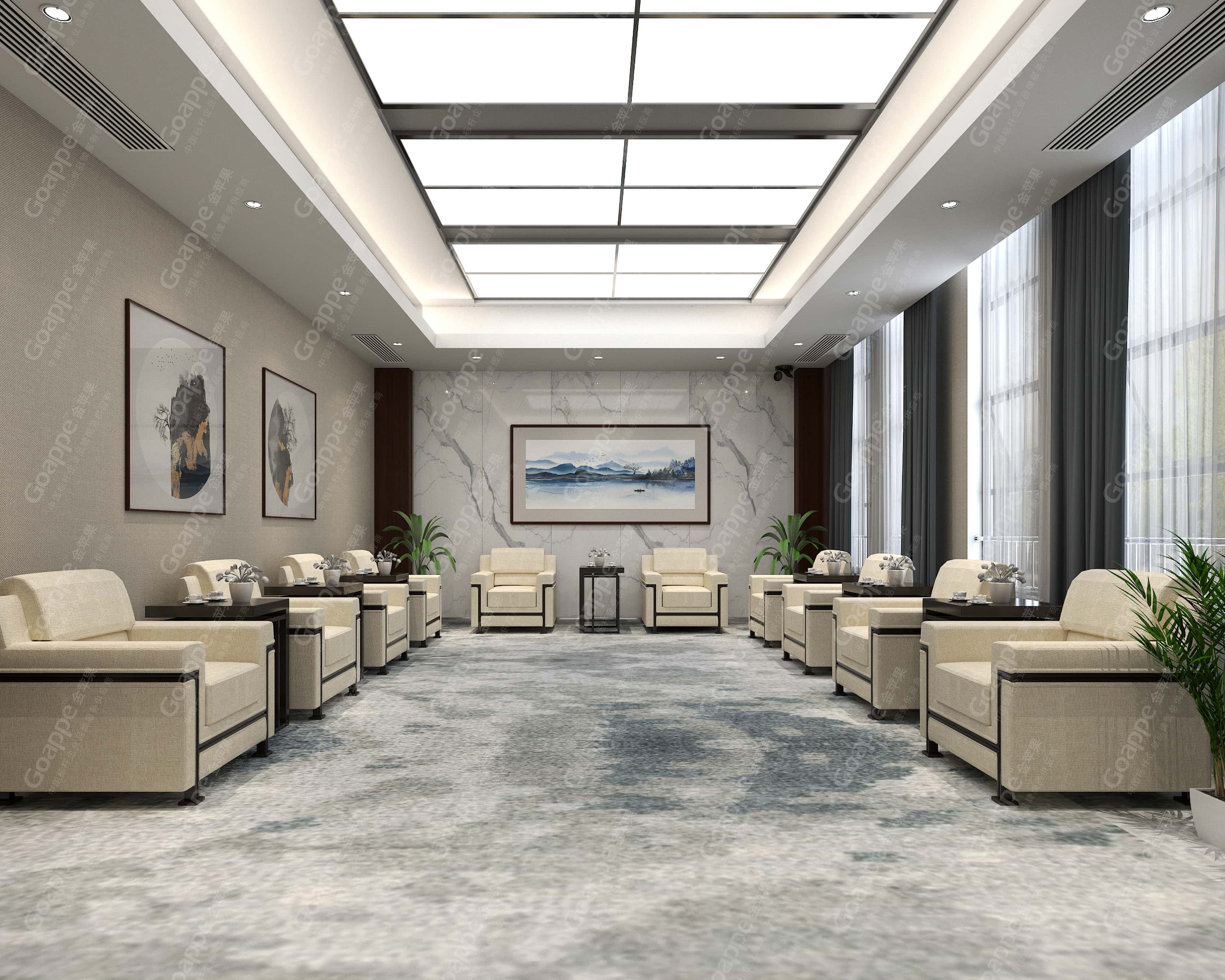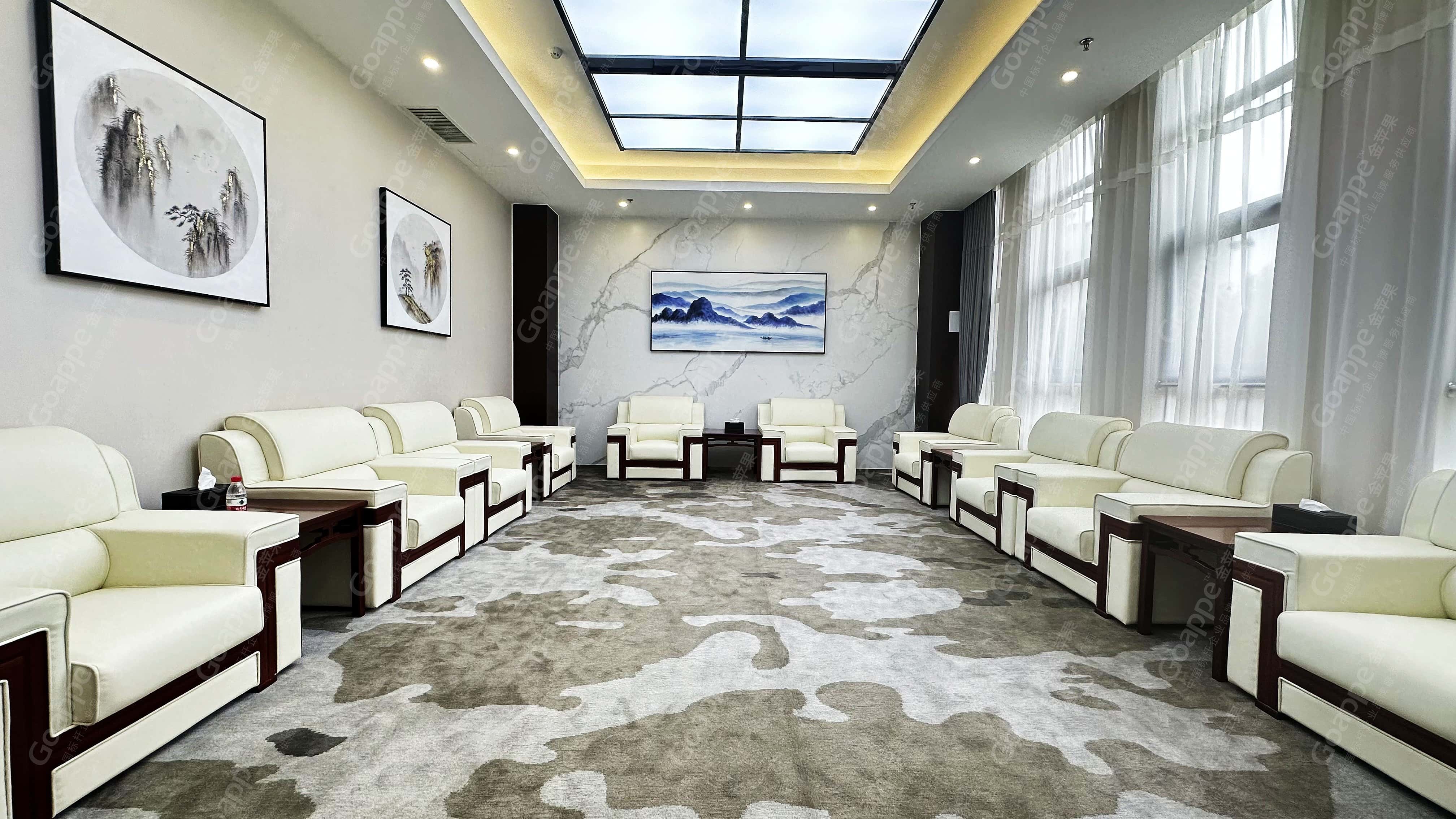 除此之外,擁有一個高端的貴賓接待室是一家成熟企業(yè)的必備功能場所,是企業(yè)氣度、性格氣質(zhì)、以及待人處事的重要體現(xiàn)之一。Goappe以提供舒適洽談空間、彰顯高端品味、提升視覺質(zhì)感等為核心主旨,以簡約大氣為目標,全面配套豪華舒適座椅、燈光、裝飾等,打造精致儒雅的新中式貴賓接待空間。