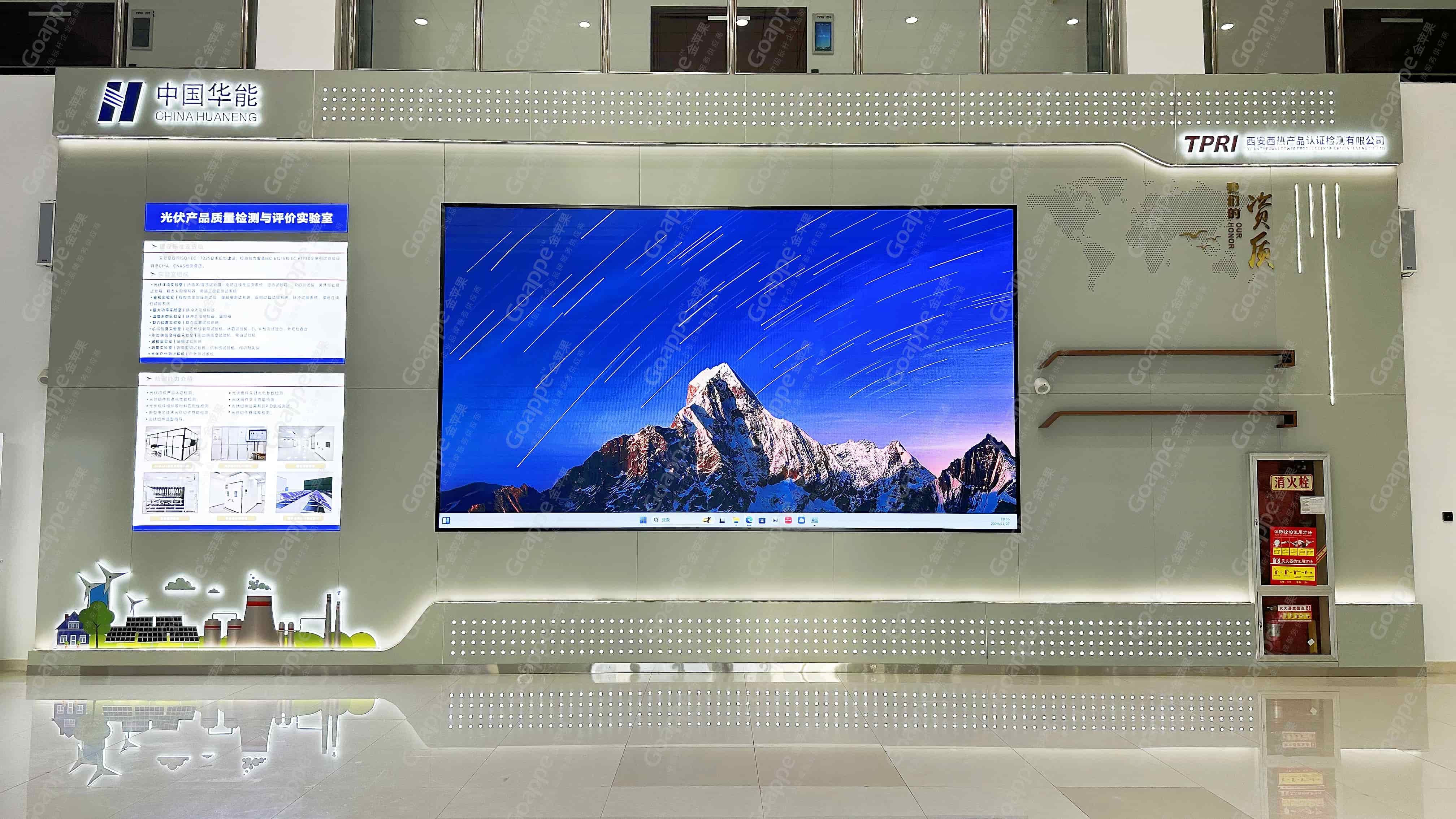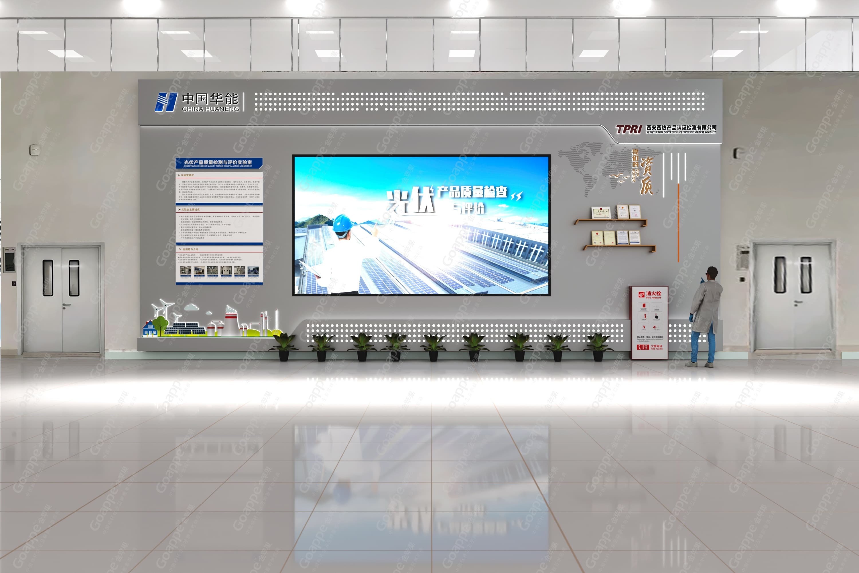 實(shí)驗(yàn)室作為技術(shù)研究與試驗(yàn)的操作空間,在外觀設(shè)計(jì)上必然要遵循至簡(jiǎn)原則,設(shè)備為主裝飾為次,最大化的突出空間的使用功能。因此本次光伏實(shí)驗(yàn)室改造,設(shè)計(jì)團(tuán)隊(duì)整體選用具有技術(shù)代表性的灰色為主色調(diào),在開(kāi)放區(qū)域搭建多媒體LED大屏,并充分利用墻面空間富裕優(yōu)勢(shì),與LED屏作整體性展示設(shè)計(jì),同步展出實(shí)驗(yàn)室信息及資質(zhì)獎(jiǎng)項(xiàng),使其成為實(shí)驗(yàn)室重要的形象展示窗口,迎接往來(lái)受眾。