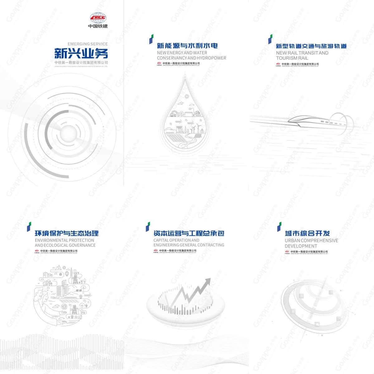 鐵一院作為新中國(guó)成立的第一批鐵路勘測(cè)設(shè)計(jì)單位,如今已發(fā)展成熟,涉足各領(lǐng)域,近年在新興業(yè)務(wù)版塊發(fā)展成就更是數(shù)不勝數(shù),其中包括“新型軌道交通與旅游軌道”、“新能源與水利水電”、“環(huán)境保護(hù)與生態(tài)治理”、“資本運(yùn)營(yíng)與工程總承包”、“城市綜合開發(fā)”等,在總冊(cè)與各分冊(cè)的封面設(shè)計(jì)上,Goappe遵循系列設(shè)計(jì)手法,采用國(guó)企簡(jiǎn)約高端設(shè)計(jì)風(fēng)格,以總冊(cè)的“業(yè)務(wù)聚焦性”及分冊(cè)的“專業(yè)指向性”作為創(chuàng)意點(diǎn),最終形成系列畫冊(cè)封面,詮釋各專業(yè)內(nèi)容。