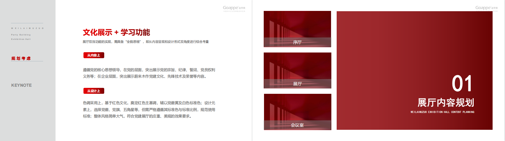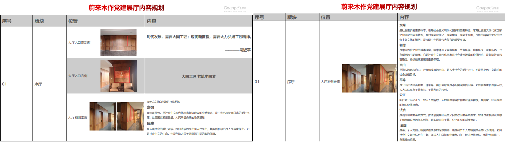 而經(jīng)前期溝通與企業(yè)文化解讀發(fā)現(xiàn),「蔚來木作」企業(yè)所想傳達的核心,即是“工匠精神”,因此在整體的內(nèi)容規(guī)劃上,金蘋果適當(dāng)融入黨的文化內(nèi)涵中,體現(xiàn)大國工匠及工匠精神的成果及內(nèi)容,并結(jié)合「蔚來木作」“黨建大廳”“黨建活動室”、“黨員學(xué)習(xí)室”及“黨建會議室”四大空間的位置及面積,進行內(nèi)容邏輯的合理布局,使得展廳“別出心裁”。