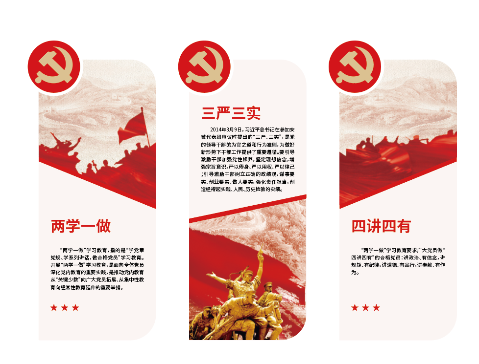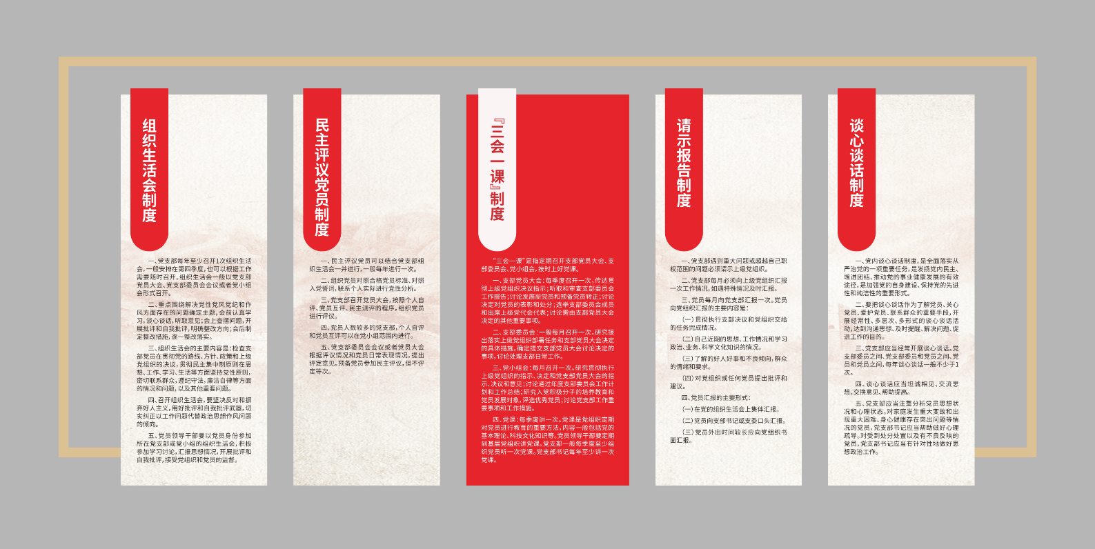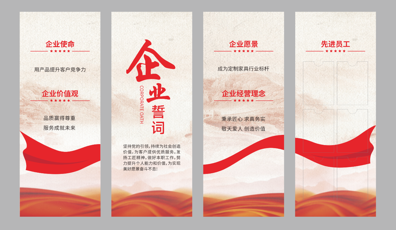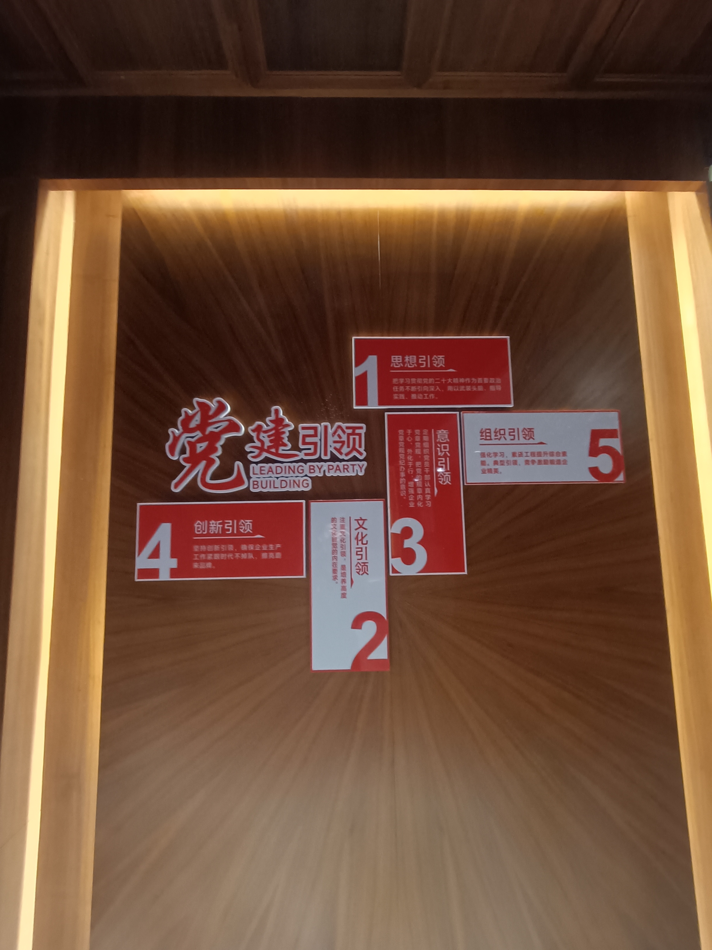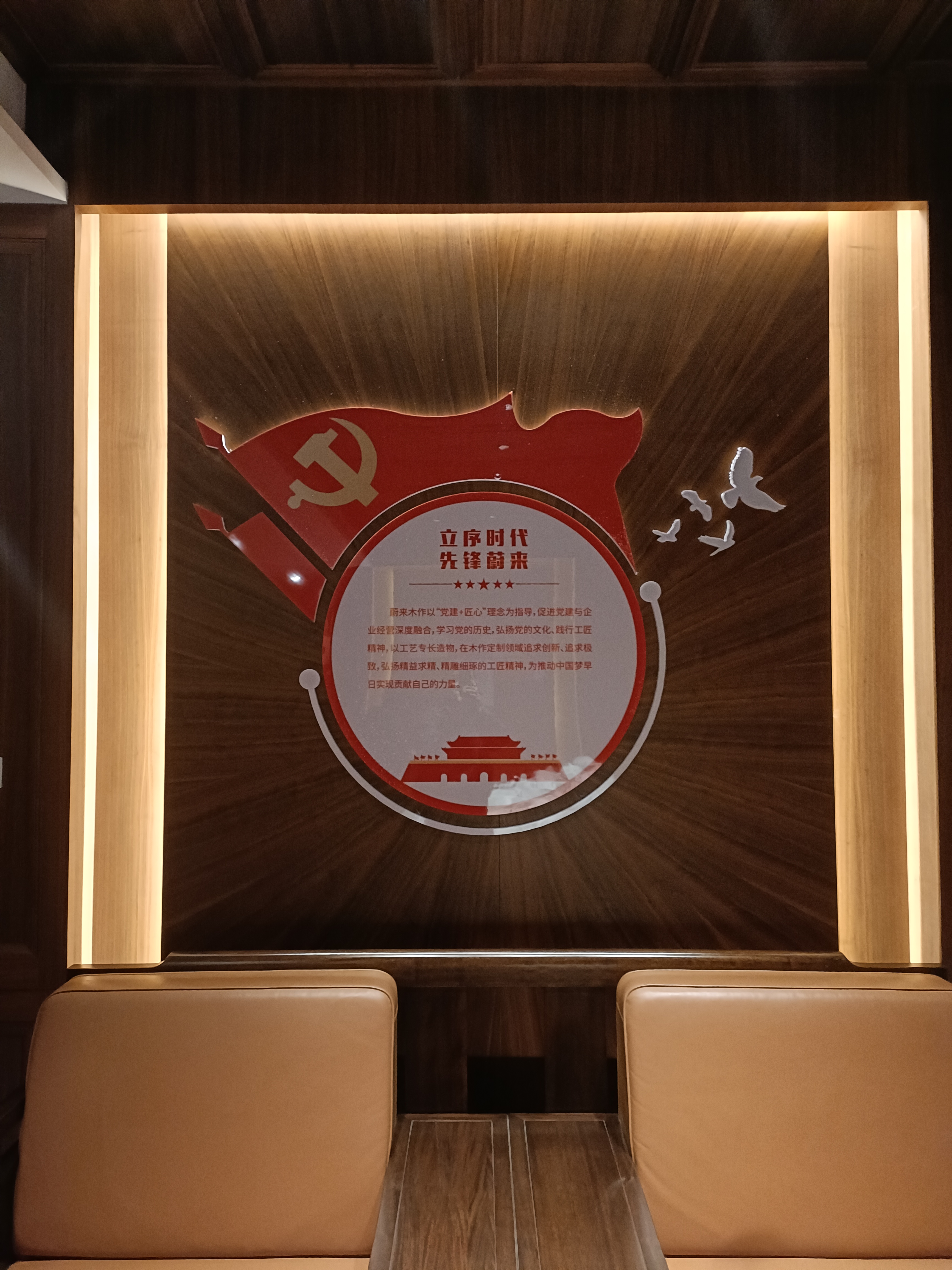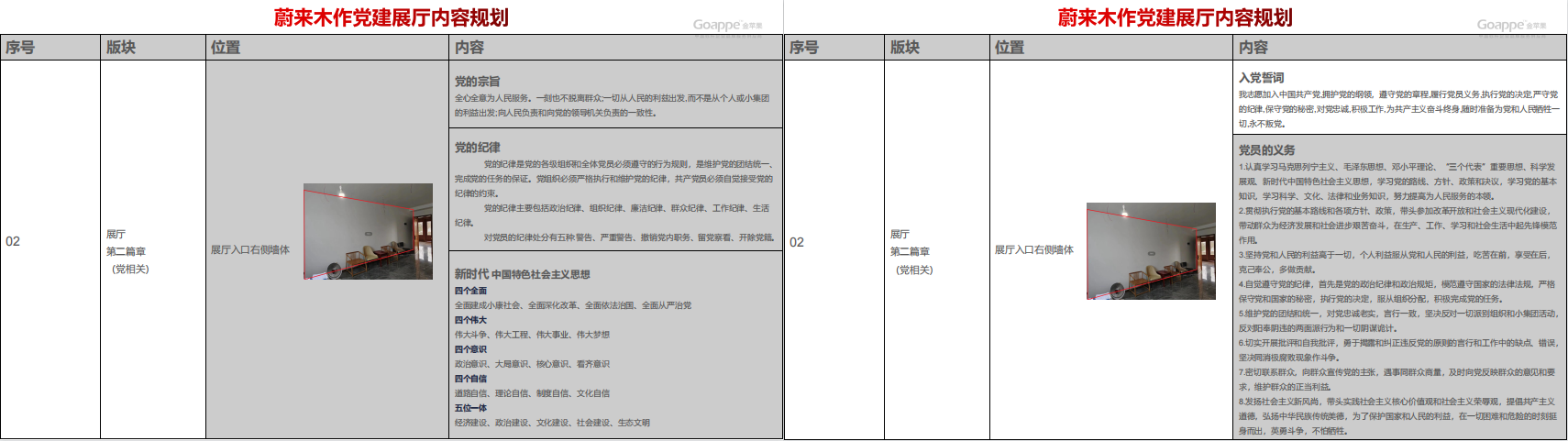 內(nèi)容與邏輯,是黨建展廳的文字表達形式,而畫面組合設(shè)計,則是展廳最直觀的視覺表達方式。在「蔚來木作」黨建展廳的設(shè)計考量上,除一般黨建展廳會綜合運用的“黨徽”、“黨旗”、“紅綢”等設(shè)計元素的比例尺寸等,“紅色”及“金色”主色調(diào)及輔色的搭配等,還需因地制宜,對于「蔚來木作」“黨建大廳”和“黨建會議室”特殊的木質(zhì)墻體與空間形態(tài),需更加細致的考究設(shè)計版面的配色及造型,使其不脫離黨建展廳的紅色主基調(diào),又有不脫離空間場景的美感,由此實現(xiàn)設(shè)計效果的最優(yōu)化。