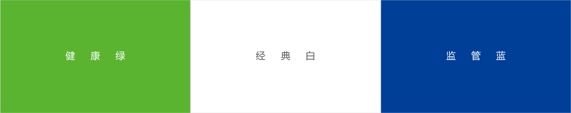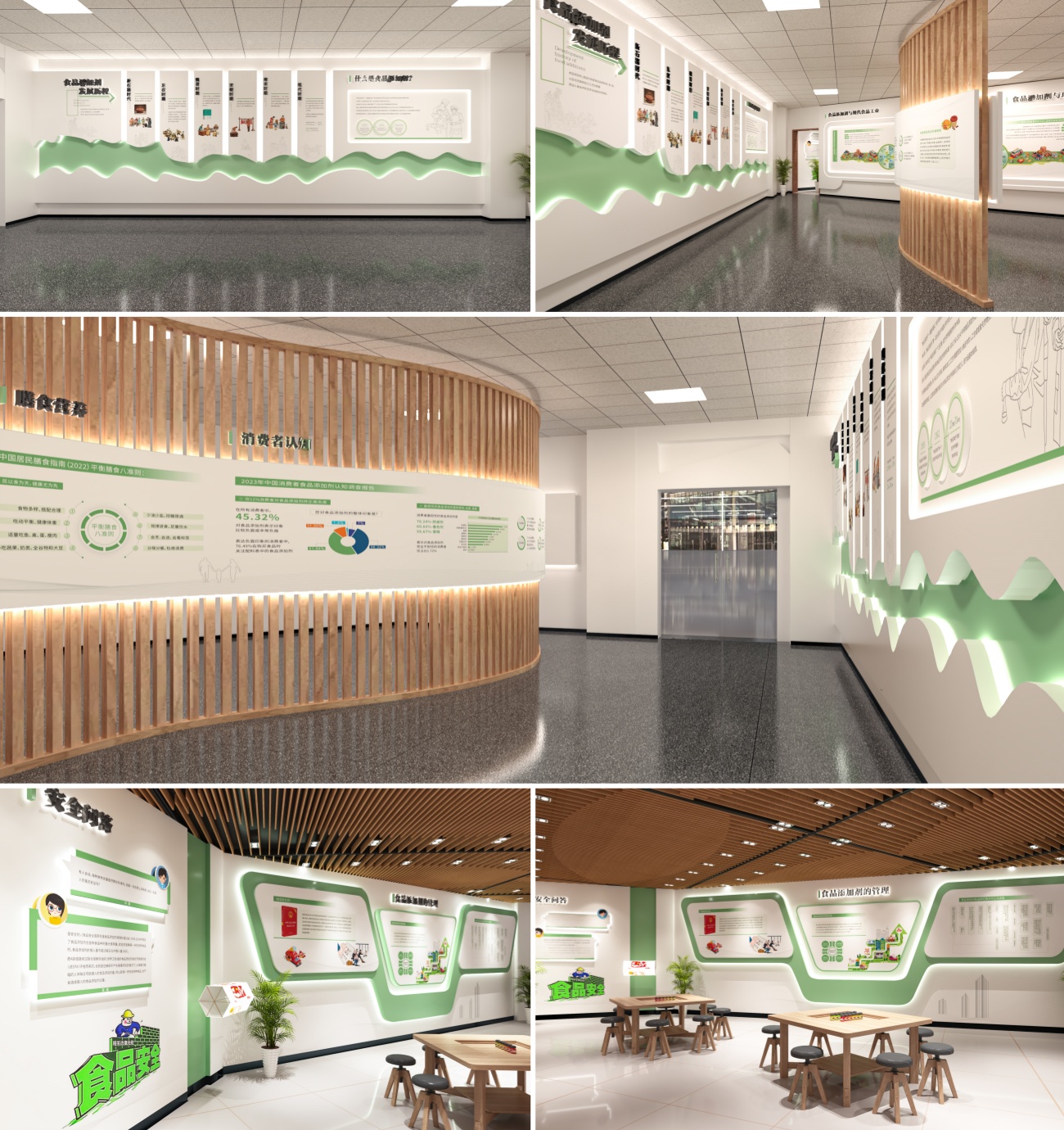 提取關(guān)鍵詞“安全”和“健康”,如果用色彩語言表達(dá),不言而喻“綠色”作為主色調(diào)是最為貼切的,且能在設(shè)計(jì)表現(xiàn)上給予參觀者耳目一新的視覺感知,但展廳空間僅使用單純的綠色顯然是不夠的,經(jīng)典的“白色”及具有市場監(jiān)管屬性的“藍(lán)色”,即可在一定程度上緩解單色調(diào)造成的視覺沖擊,又可與展廳實(shí)質(zhì)功能建立聯(lián)系,且很大程度上起到美化整體空間的作用。