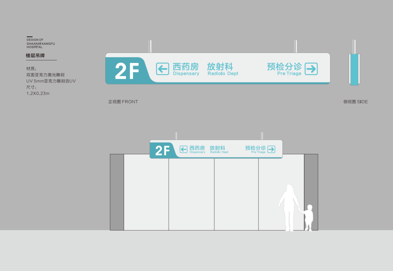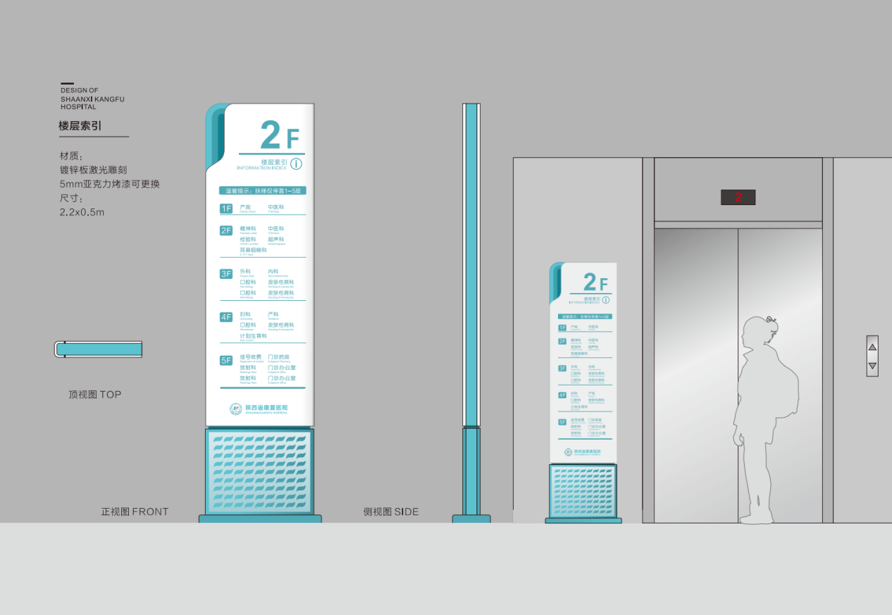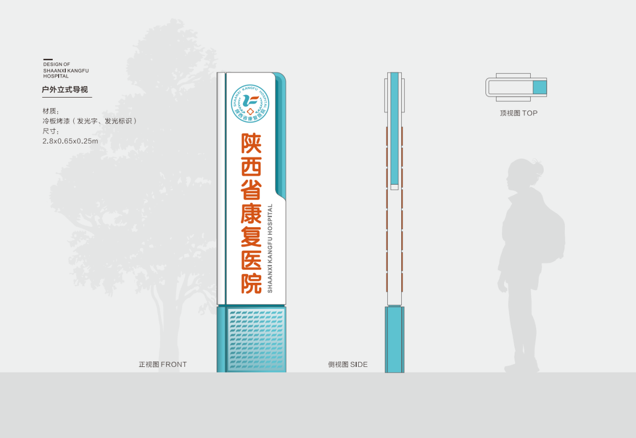 標(biāo)識(shí)導(dǎo)視系統(tǒng)設(shè)計(jì),是傳統(tǒng)建筑與視覺(jué)傳達(dá)設(shè)計(jì)的中間學(xué)科,在功能表現(xiàn)上需有信號(hào)、標(biāo)志、說(shuō)明、指示、預(yù)示等多種含義。為確保最終成品導(dǎo)視功能的合理性,項(xiàng)目組所有設(shè)計(jì)項(xiàng)的開展均嚴(yán)格依據(jù)相關(guān)法律依據(jù)及標(biāo)準(zhǔn)規(guī)范、人體工程學(xué)可視參數(shù)、標(biāo)識(shí)信息識(shí)別參數(shù)、視覺(jué)信息識(shí)別參數(shù)及陜西省康復(fù)醫(yī)院院區(qū)實(shí)際空間數(shù)據(jù)等,進(jìn)行有效規(guī)劃,從而保證最終識(shí)別效果的規(guī)范性。