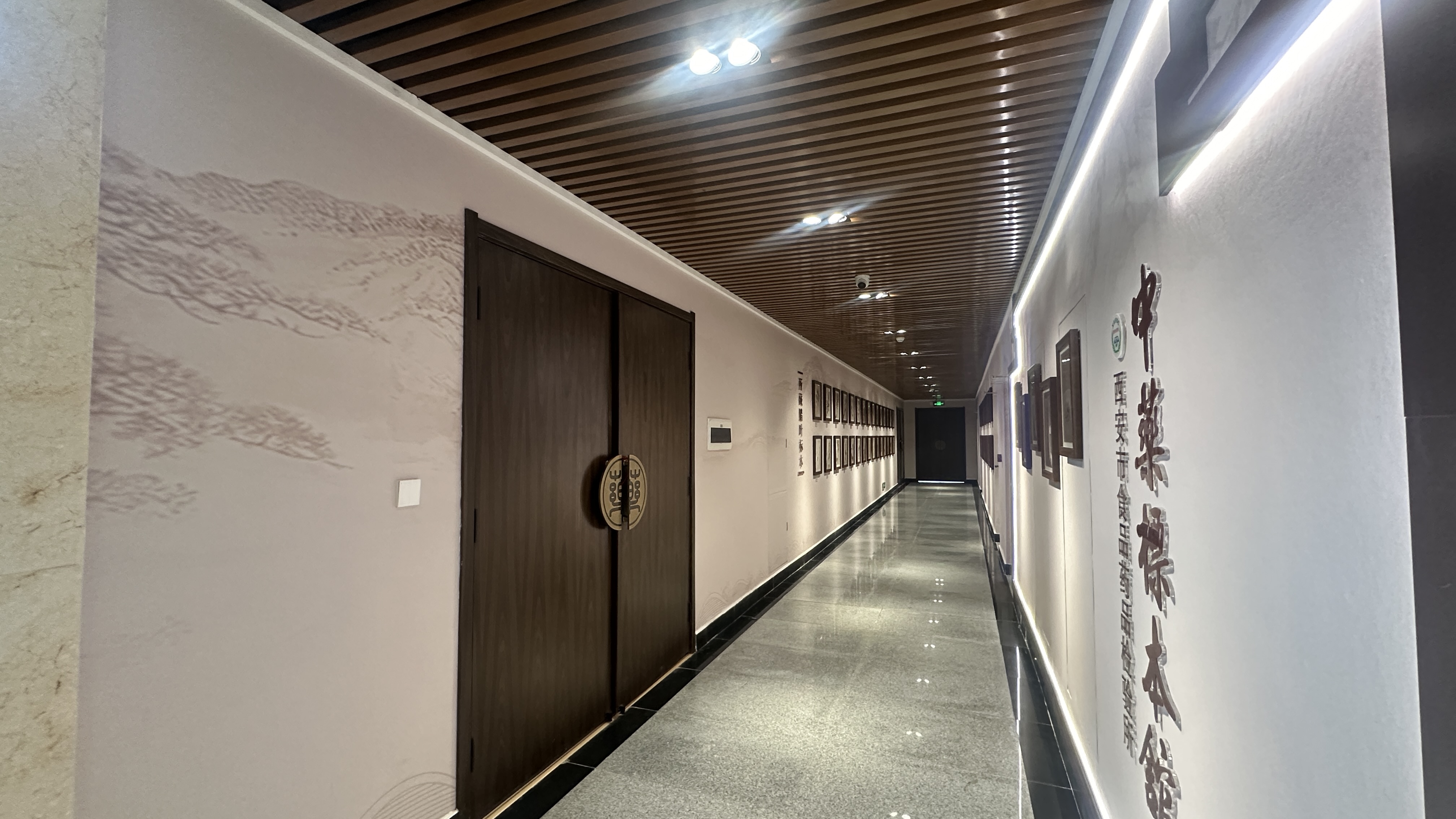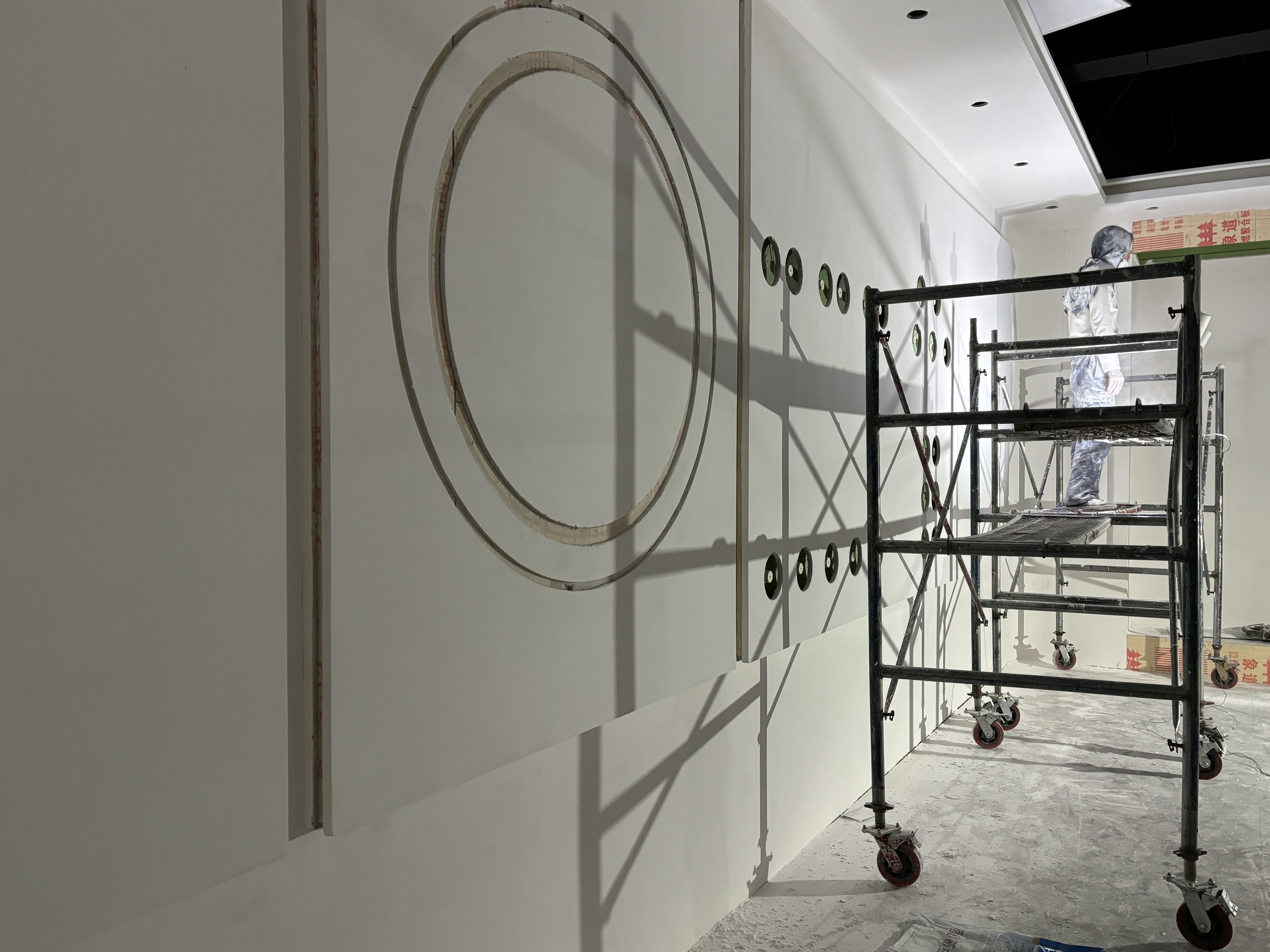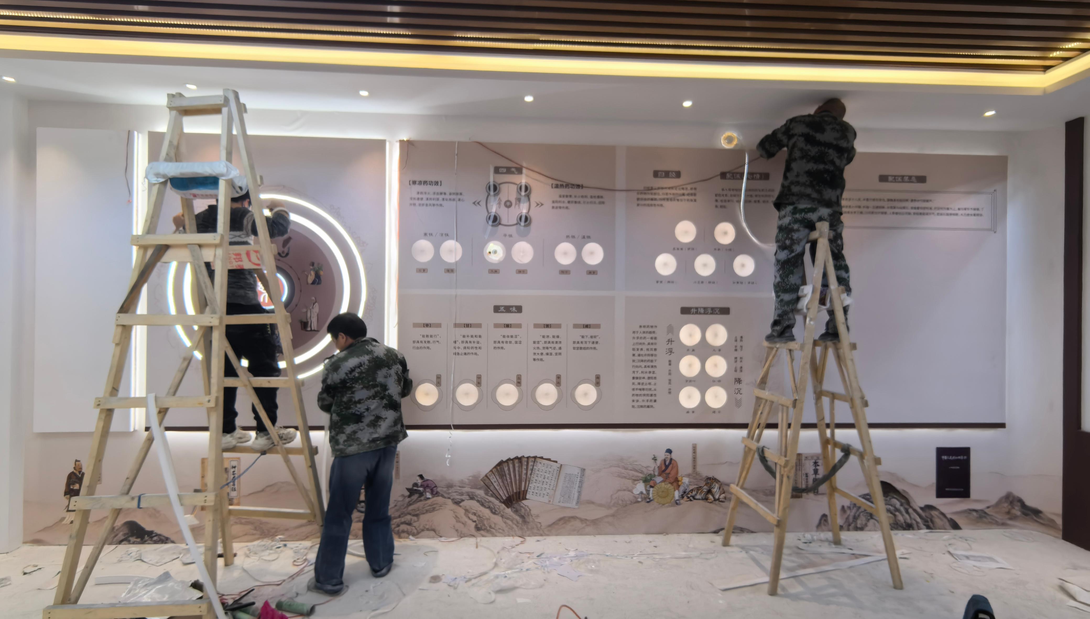 施工作業(yè),是一場“腦”與“力”并肩作戰(zhàn)的過程,它大到一些超重材料的組裝搭建,細到毫厘間的尺寸銜接和角度調(diào)控。在中藥標本館的施工初期,項目團隊依據(jù)施工方案及設(shè)計方案,利用高質(zhì)量輕鋼龍骨做好墻面骨架,用隔音棉填充后再用石膏板封平,并加以鋁塑板、碳晶板、免漆板等板材貼面,后期飾面則采用高光領(lǐng)面烤漆等,由此完成展館的基礎(chǔ)架構(gòu)。后續(xù)依據(jù)展館設(shè)計及展示需求,充分完善電路預埋、設(shè)備安裝、廣告安裝、展柜入場等工序,妥善處理好各步驟施工作業(yè)。