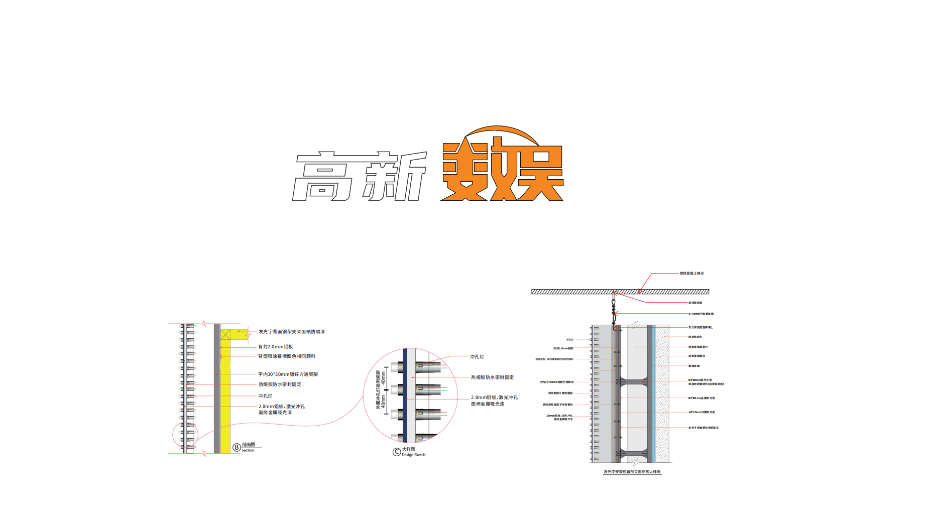 在“高新數(shù)娛”樓體字設(shè)計之初,為實現(xiàn)更好的展示效果,設(shè)計師綜合考慮了字的藝術(shù)性及實用性雙重要素。在藝術(shù)感的設(shè)計上,首先其作為標識字,不能過度的藝術(shù)化表達,因此著重在“數(shù)娛”兩字上做了特殊化設(shè)計,結(jié)合文字偏旁特點,進行組合勾勒,形成藝術(shù)化的設(shè)計表達;