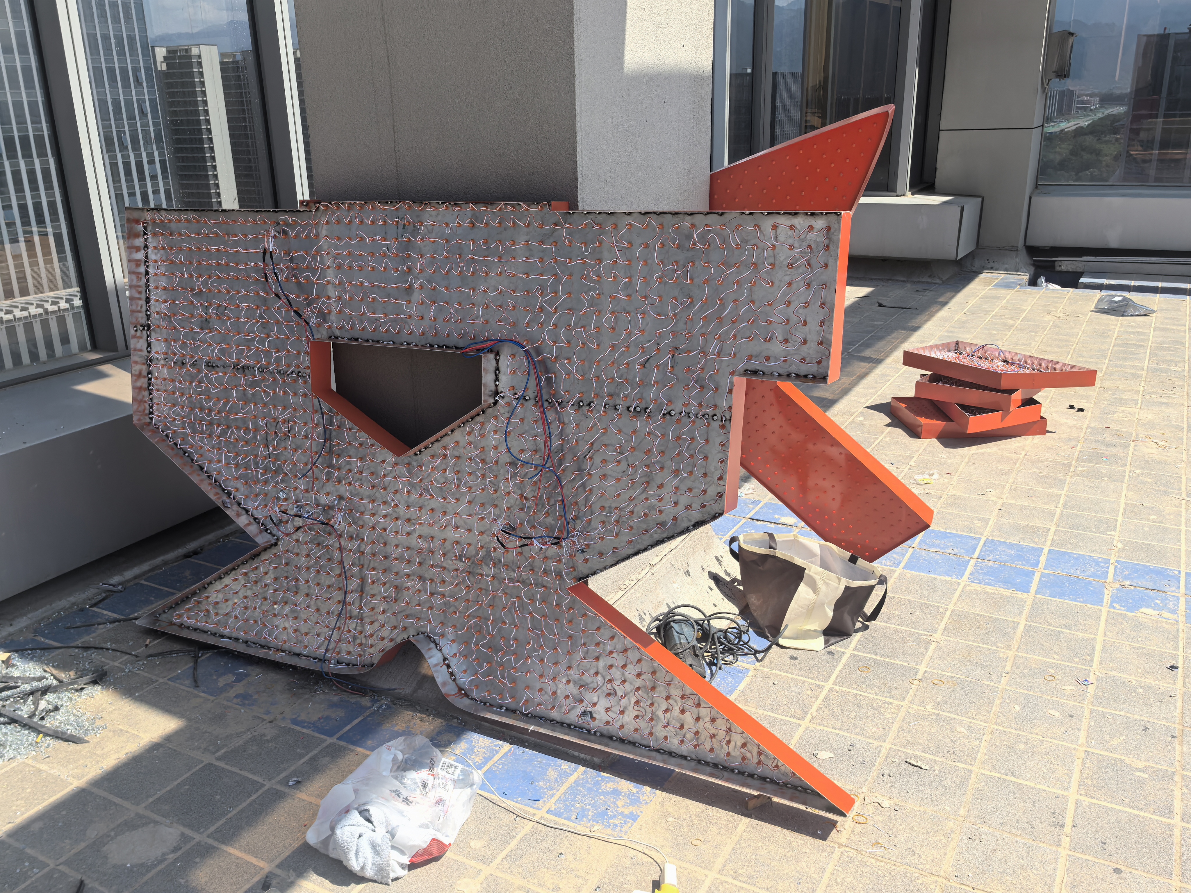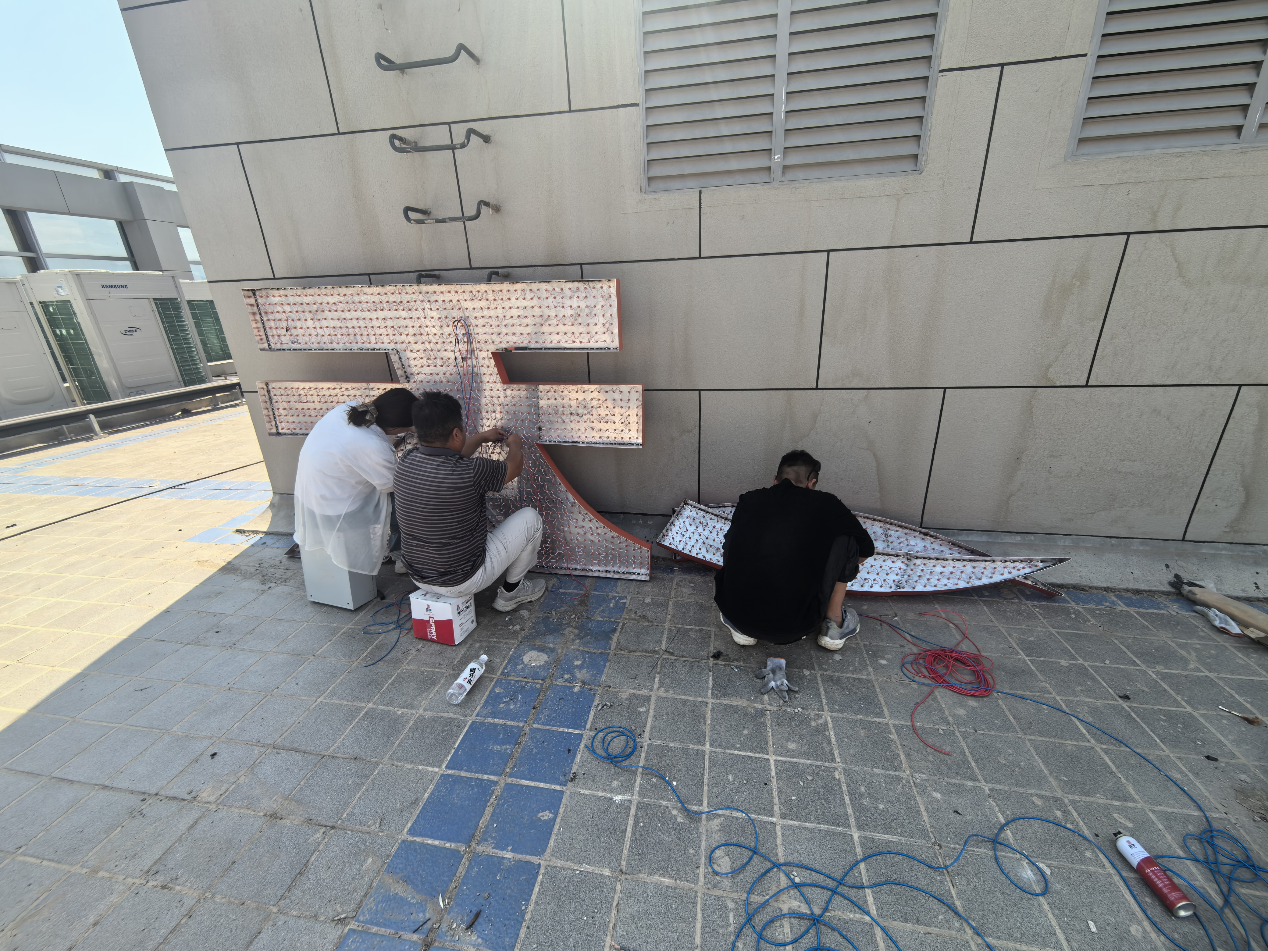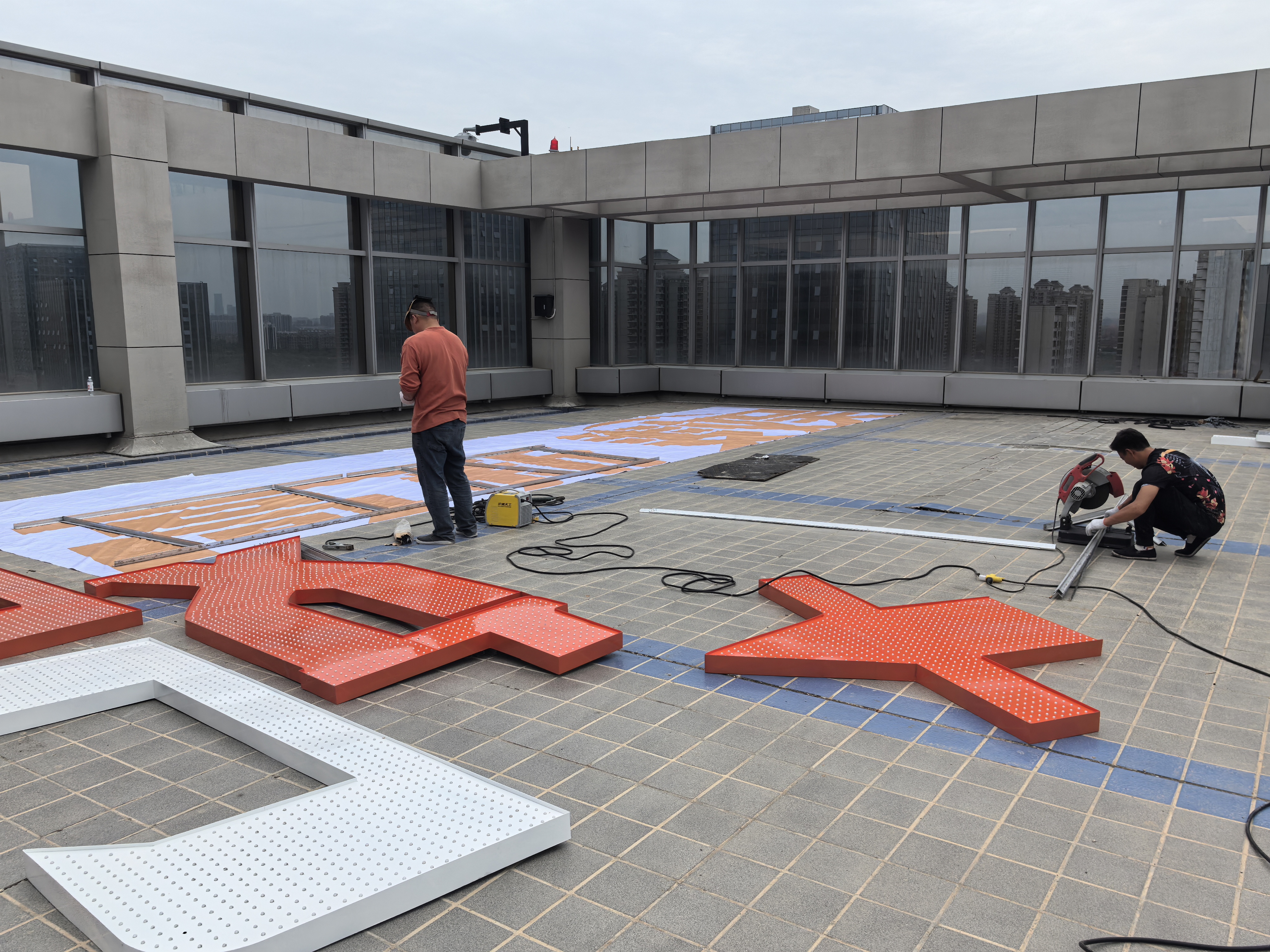 設(shè)計效果是將理想狀態(tài)兌現(xiàn)于圖紙上,高還原度、高品質(zhì)的落地安裝才是項目的最終目標。作為有著豐富高空作業(yè)經(jīng)驗的施工團隊,高層樓體字的安裝早已輕車熟路,安裝師傅將提前制作完成的字體部件運至樓頂并嚴格按照設(shè)計比例進行組裝,從而順利完成安裝工作,1:1還原設(shè)計效果!