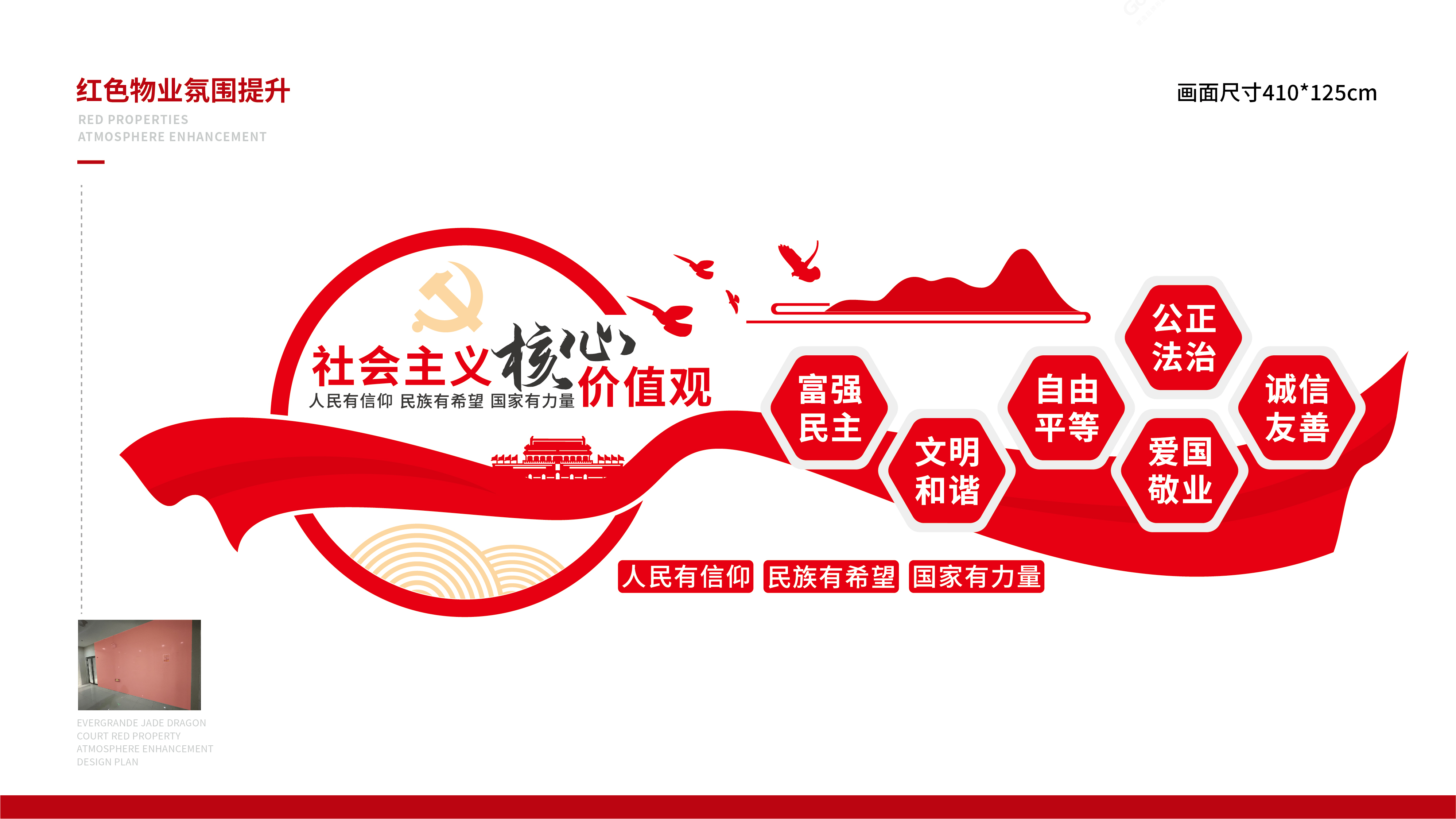 在“紅色”大方向的貫穿引領(lǐng)下,項(xiàng)目組核心圍繞黨的光輝歷程、中國(guó)夢(mèng)、社會(huì)主義核心價(jià)值觀、紅色會(huì)客廳、廉潔自律準(zhǔn)則、“五有五力”、物業(yè)服務(wù)體系、物業(yè)黨務(wù)工作等進(jìn)行了主題性策劃;設(shè)計(jì)上整個(gè)陣地則以“紅色”和“金色”為主,以此象征黨的光輝歷程和黨的崇高理想,展示黨的核心價(jià)值和黨的形象,在視覺(jué)符號(hào)的選擇上,綜合當(dāng)代黨建文化的代表性組合元素,發(fā)展出豐富的符號(hào)語(yǔ)義系統(tǒng),從而營(yíng)造濃厚的紅色主題氛圍。