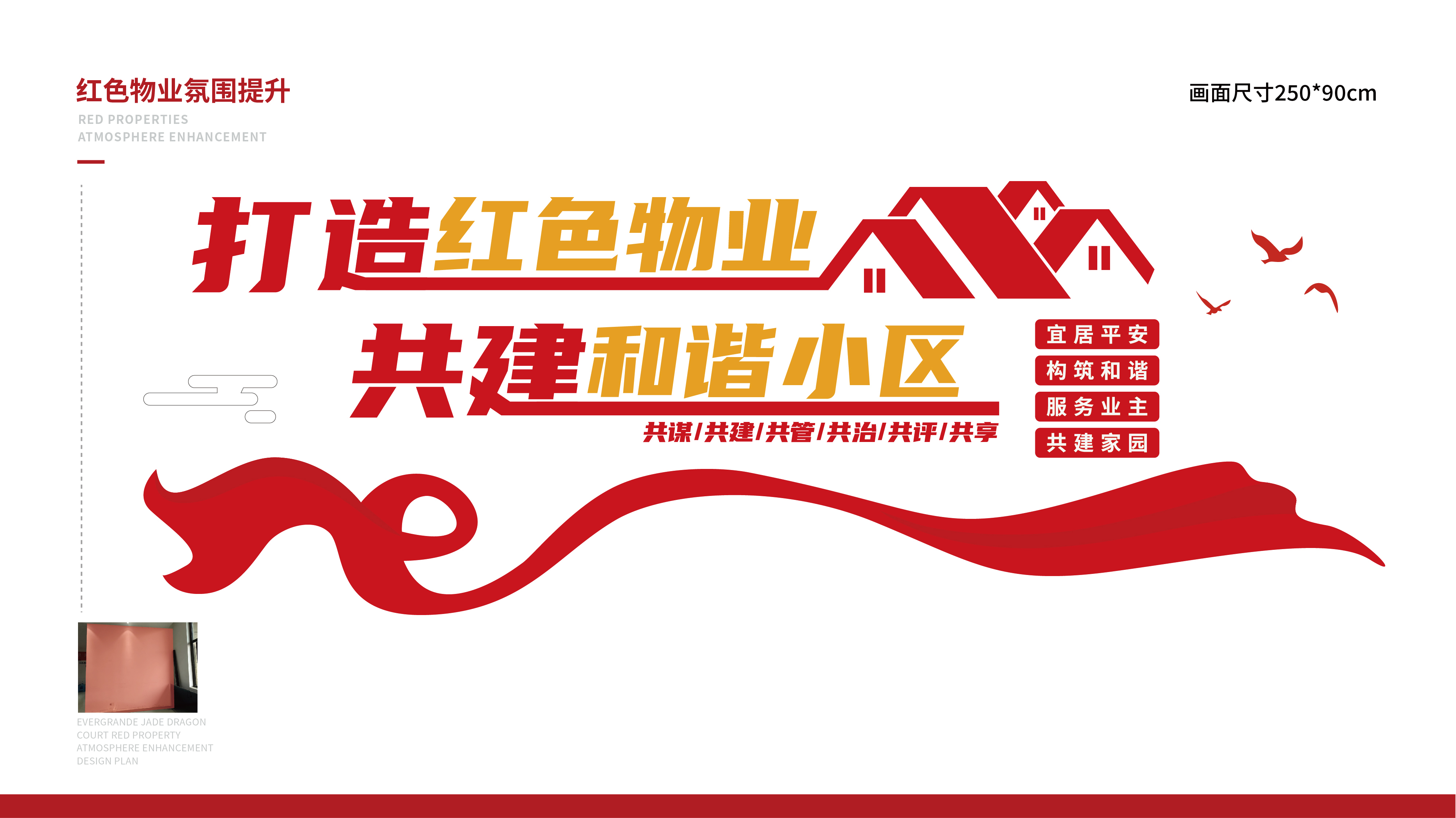 紅色物業(yè)建設(shè),作為黨建文化的重要展示窗口,在社區(qū)工作及群眾精神凝聚上起著重要的作用。項(xiàng)目組因地制宜,實(shí)地走訪社區(qū)環(huán)境,擇選適宜建設(shè)與營(yíng)造的最佳點(diǎn)位,根據(jù)設(shè)計(jì)圖紙進(jìn)行1:1還原上墻,通過(guò)完整的系列氛圍搭建,將“紅色物業(yè)”建設(shè)的理念兌現(xiàn)于社區(qū)真實(shí)空間環(huán)境。