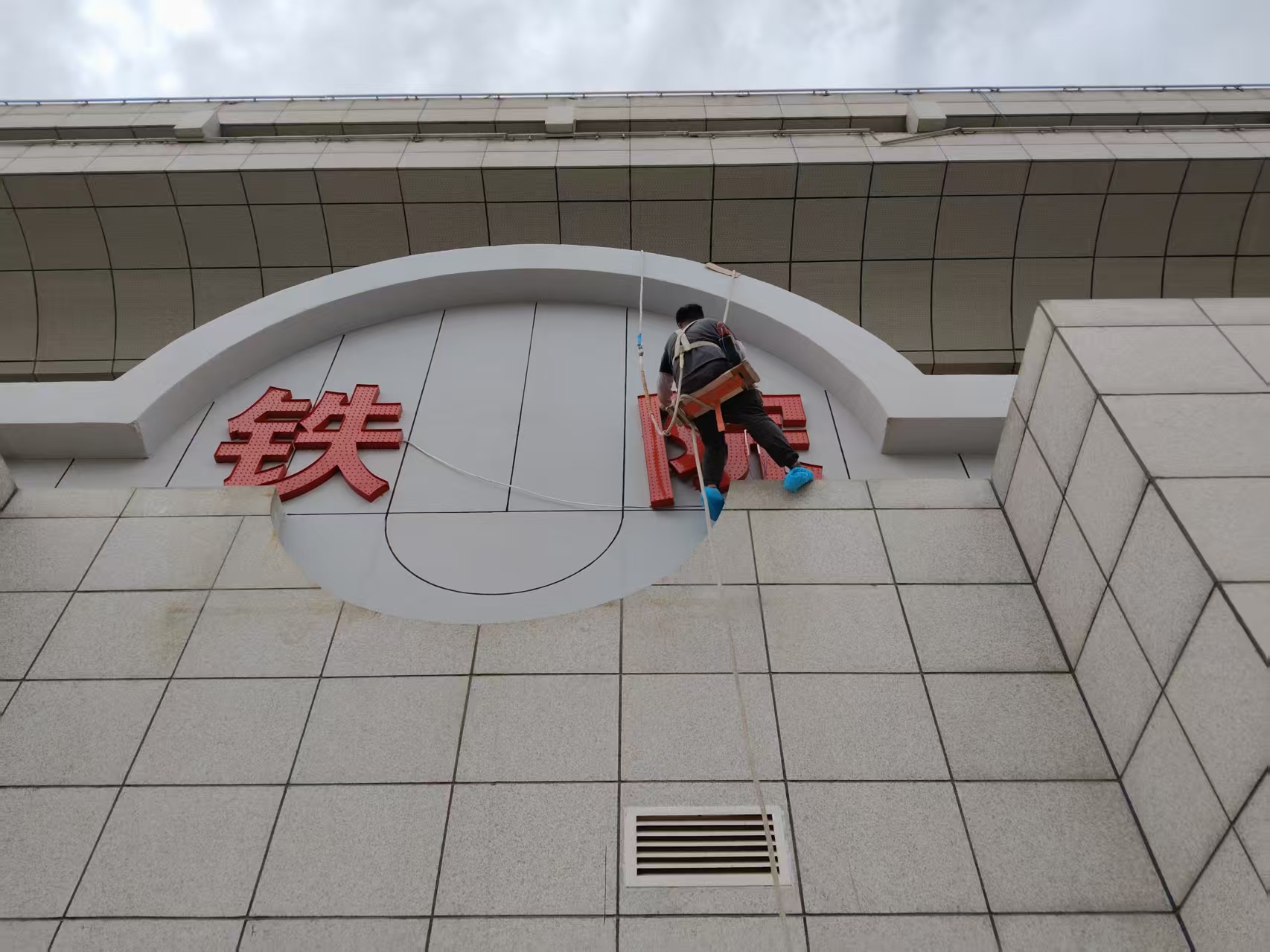 經(jīng)過實地勘察發(fā)現(xiàn),本項目發(fā)光字所安裝位置樓體外立面存在墻面污損的情況,為更好的呈現(xiàn)最終效果,在正式安裝前,施工組首先對樓體外立面進行了粉刷修復,有著豐富高空作業(yè)經(jīng)驗的“空中飛人”們熟練的完成前期工作,待樓面達到晾曬硬化要求后,再進行發(fā)光字的安裝固定,最終發(fā)光字需通過穩(wěn)定性、安全性評估,以及日、夜識別效果檢驗測試后,方能算正式竣工!